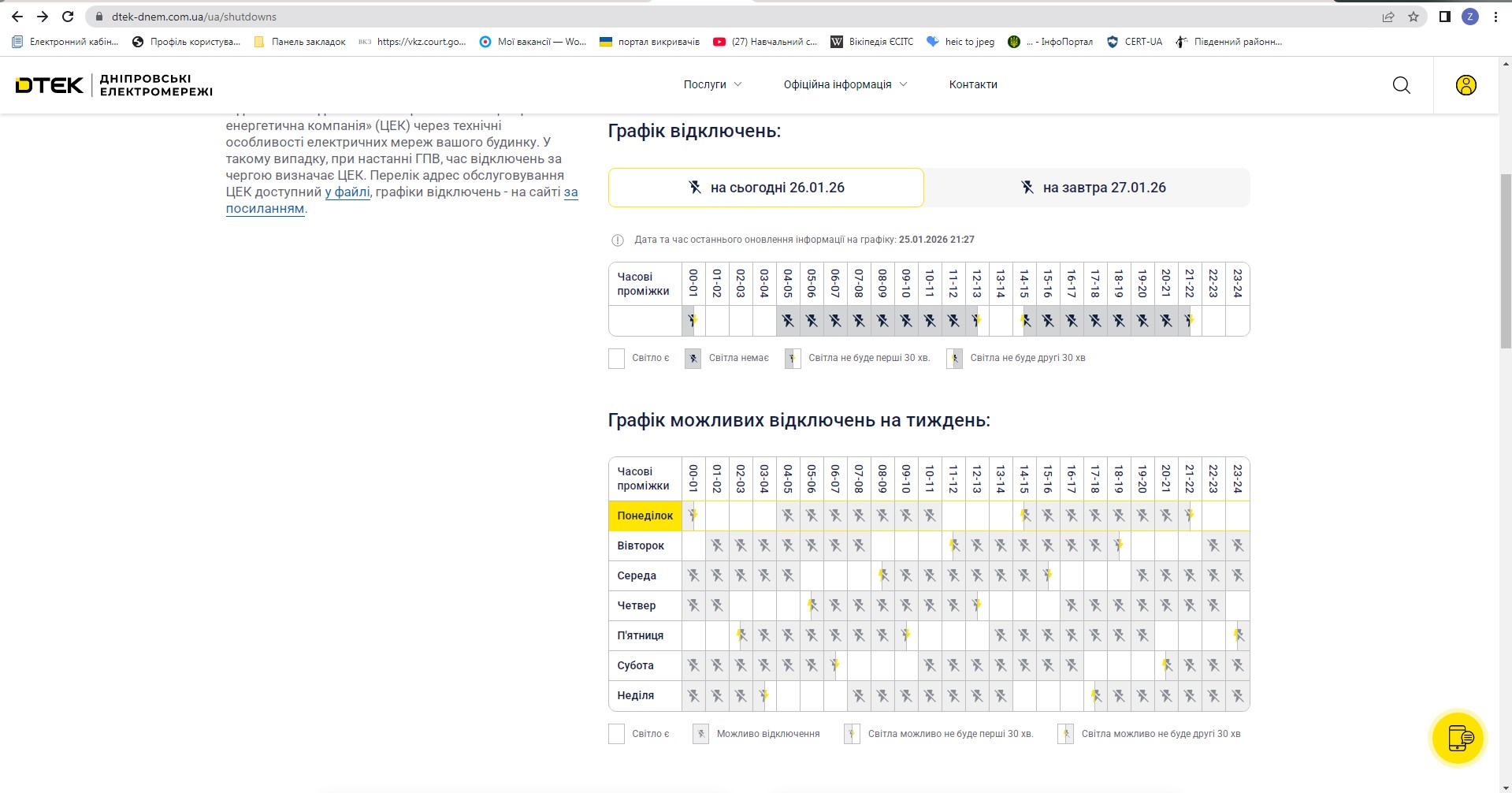 Графік планових відключень електроенергії 26.01.2026 р